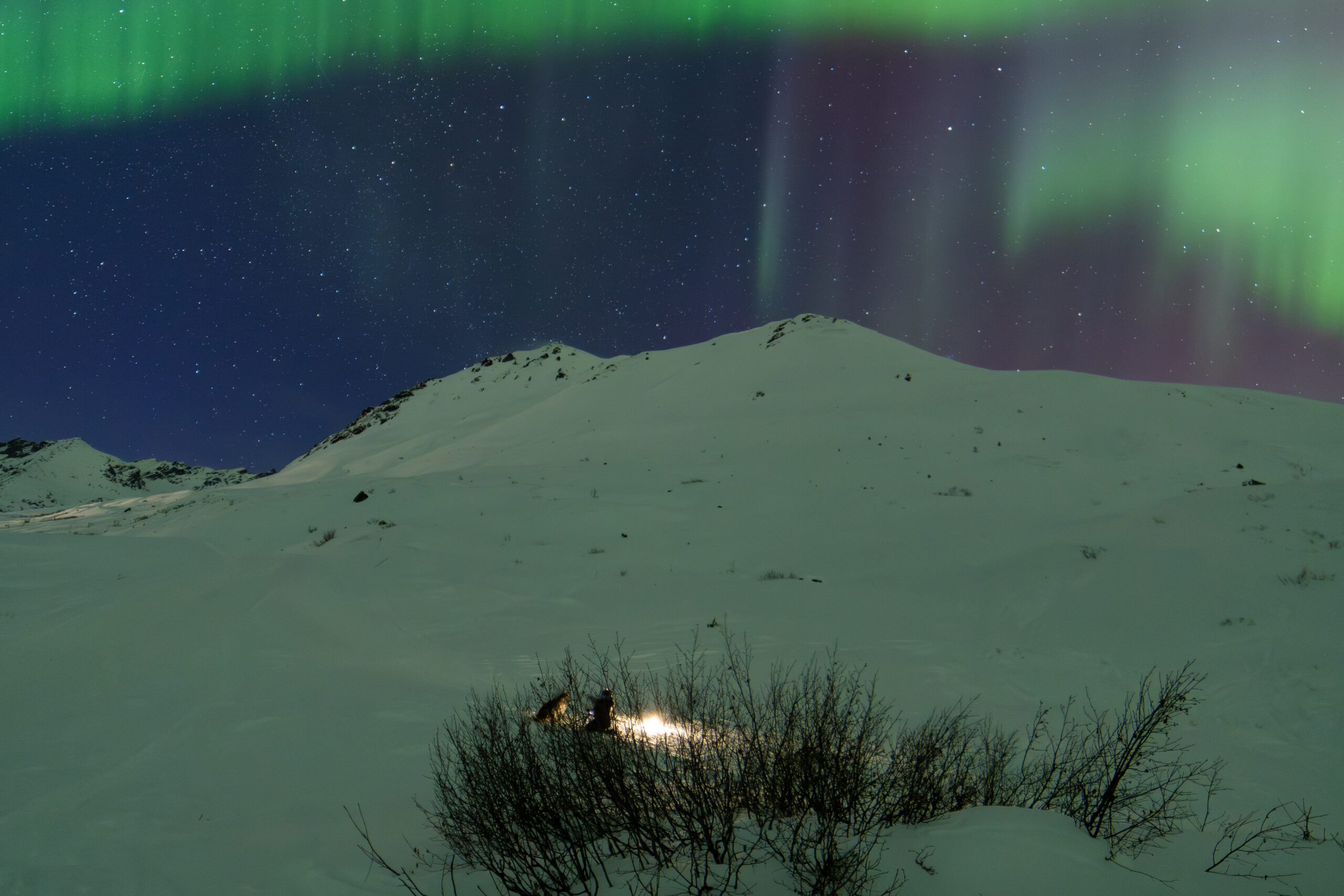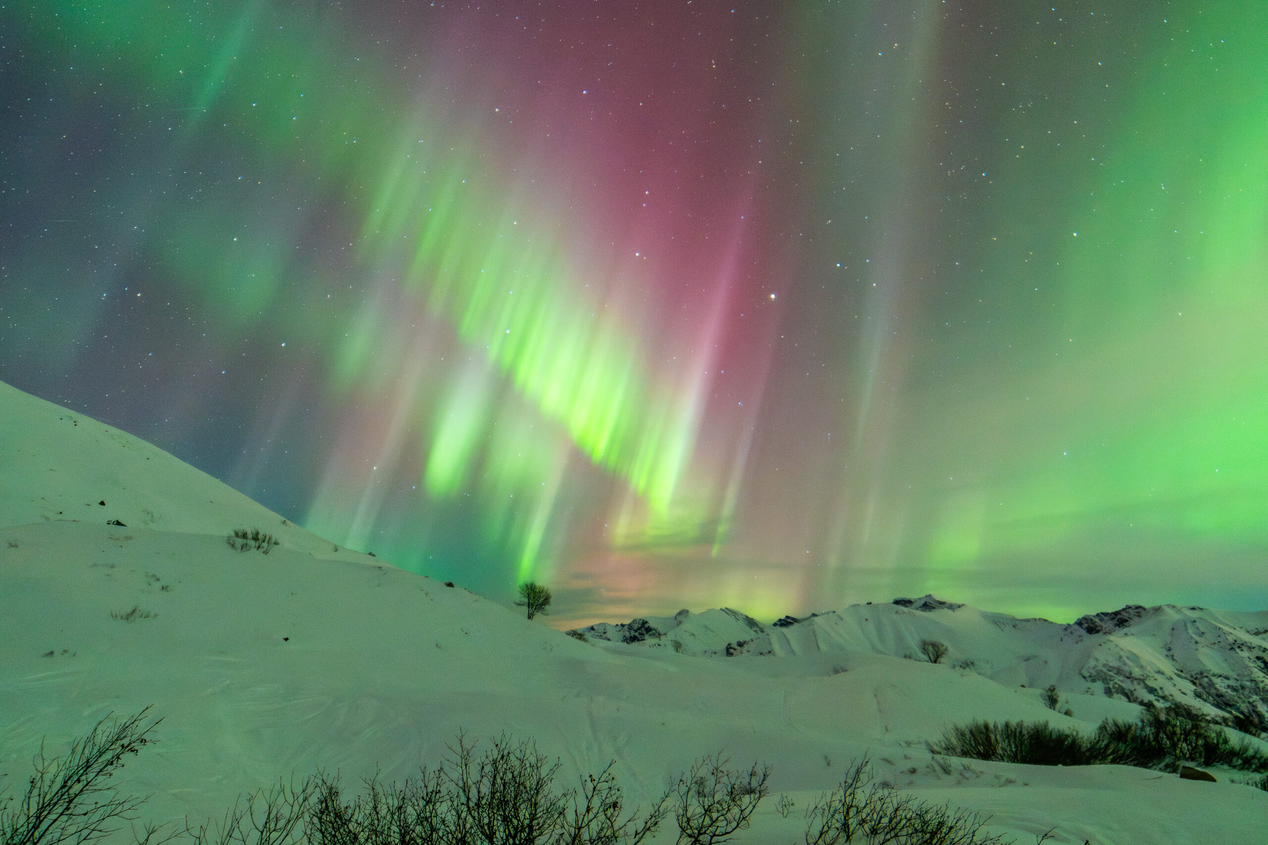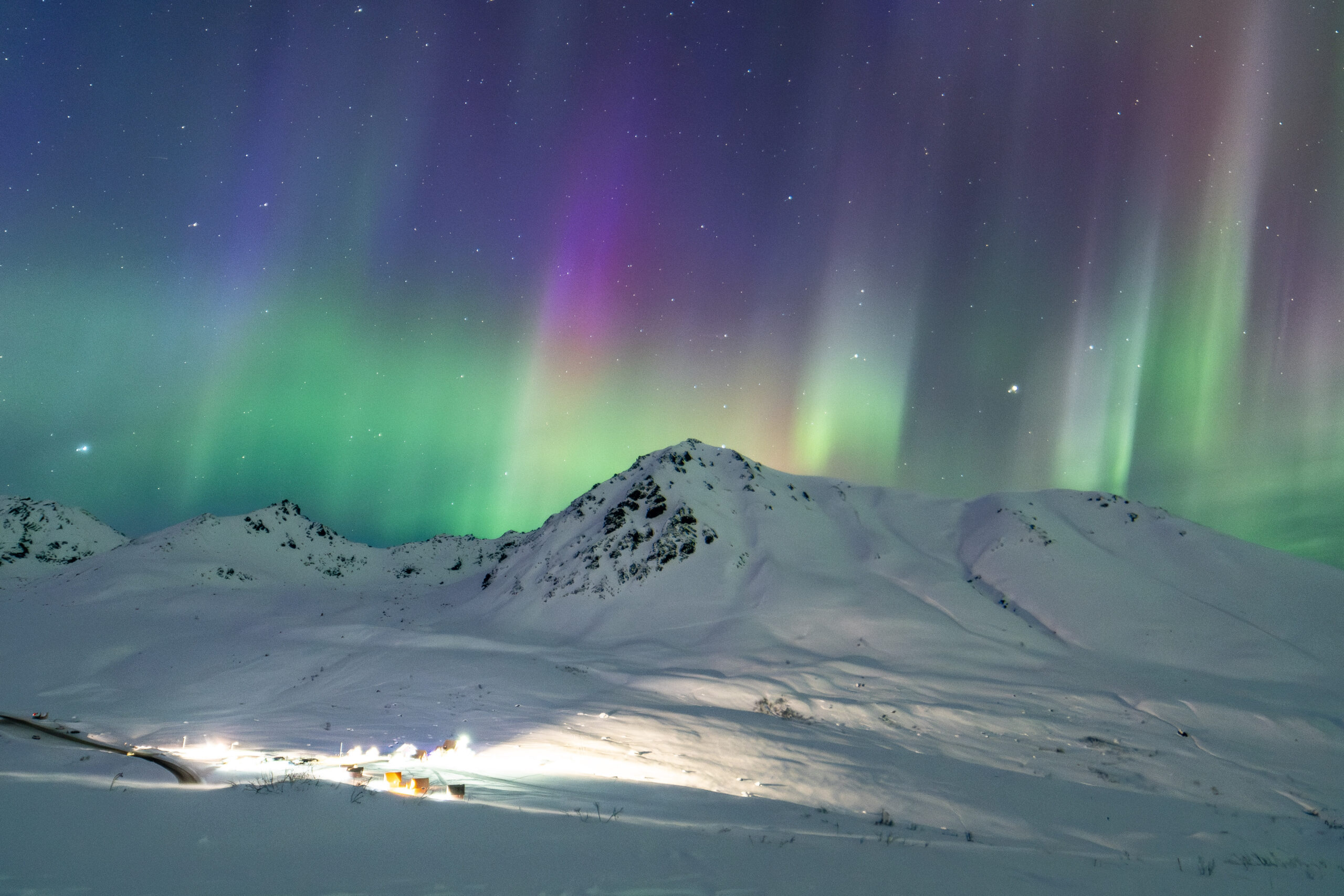 Rare multi-colored Aurora over small outpost in Alaskan Range