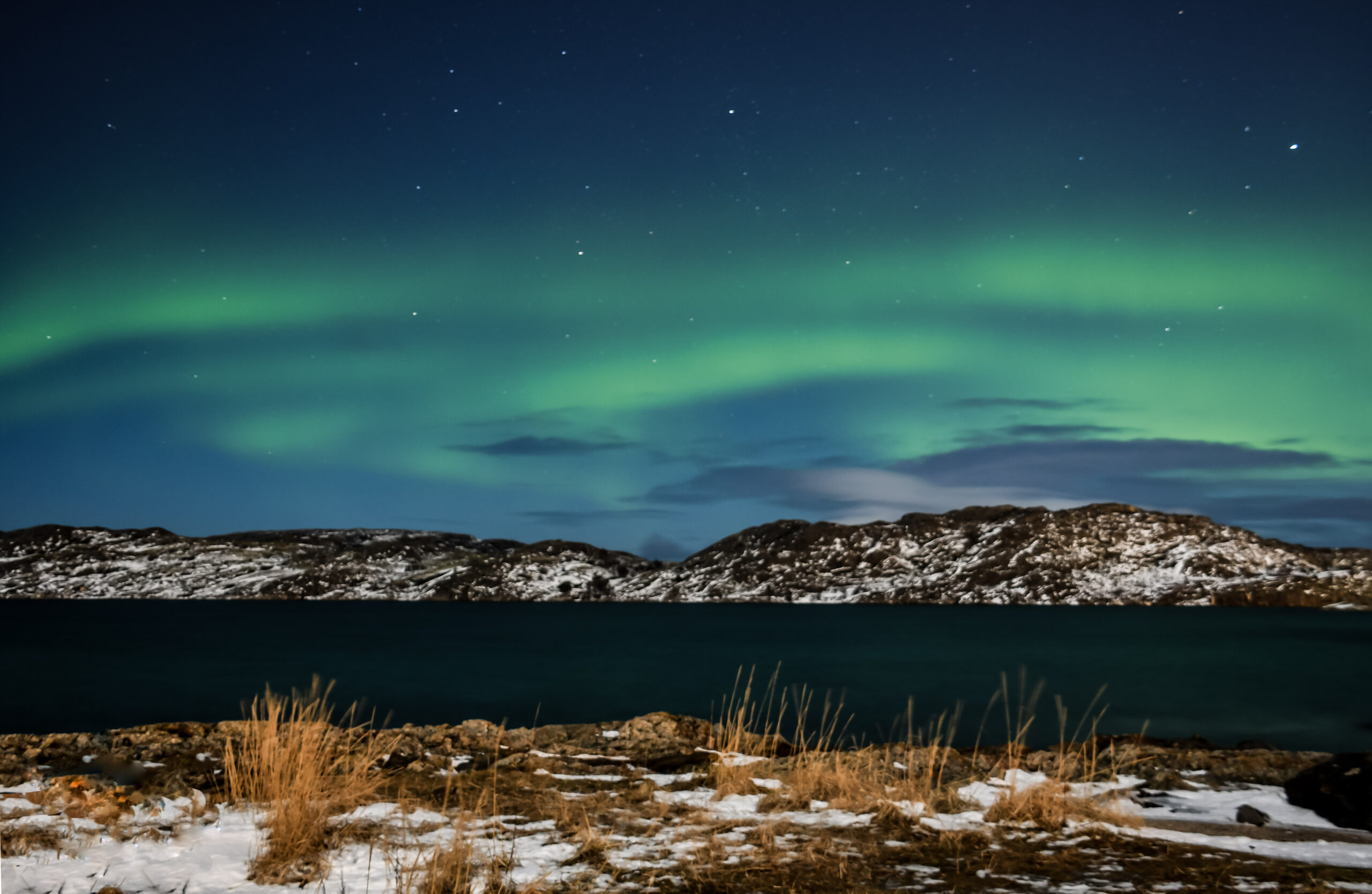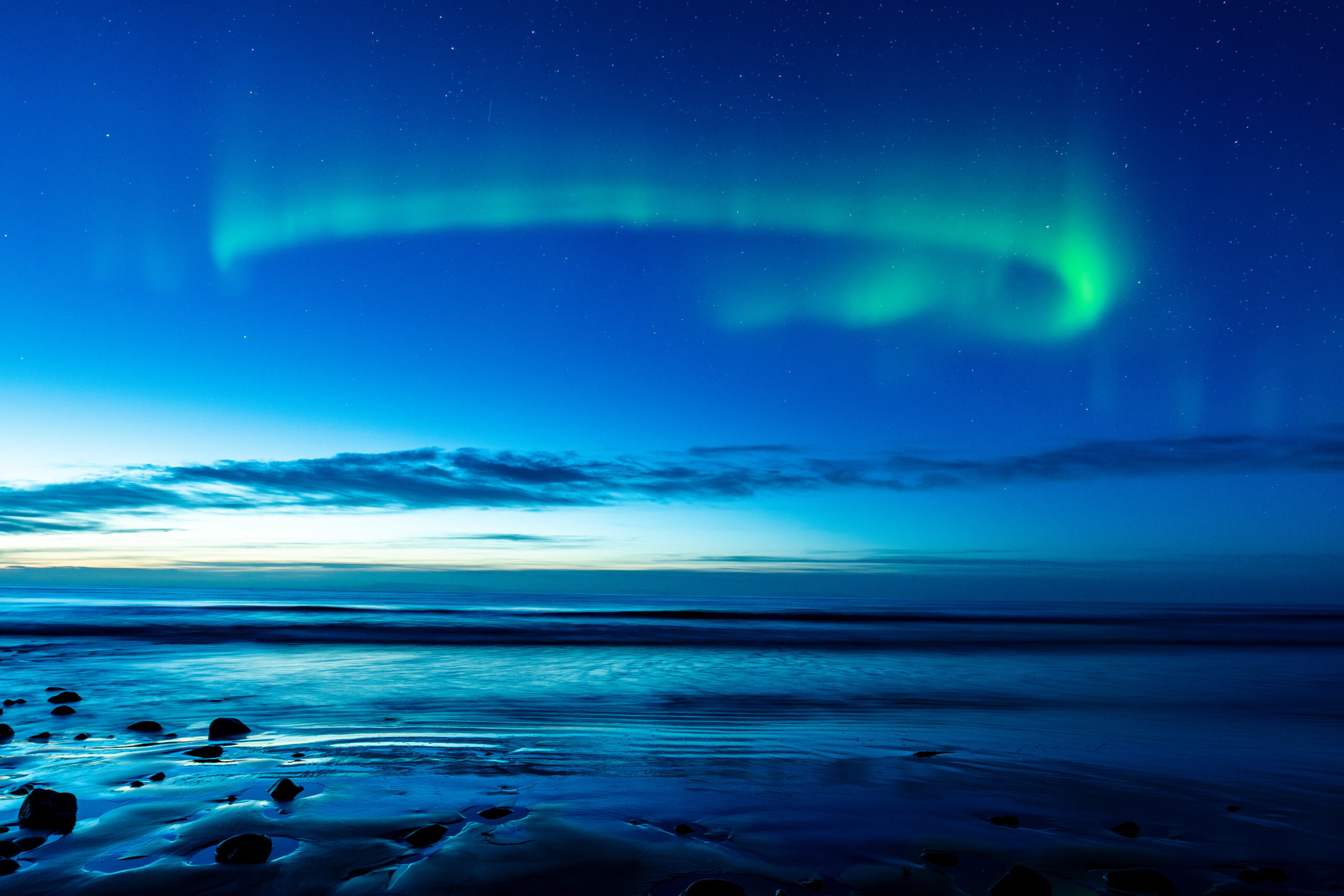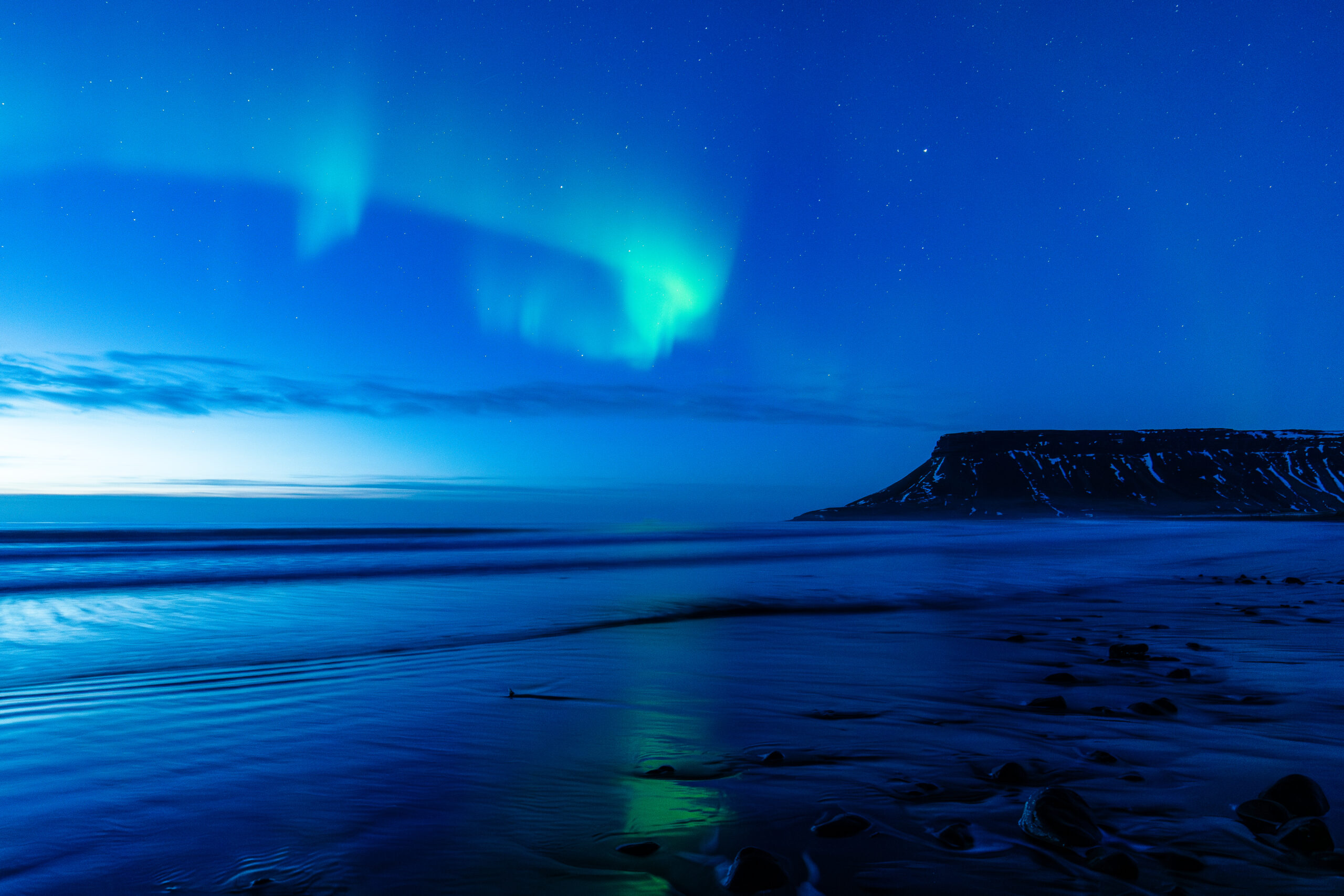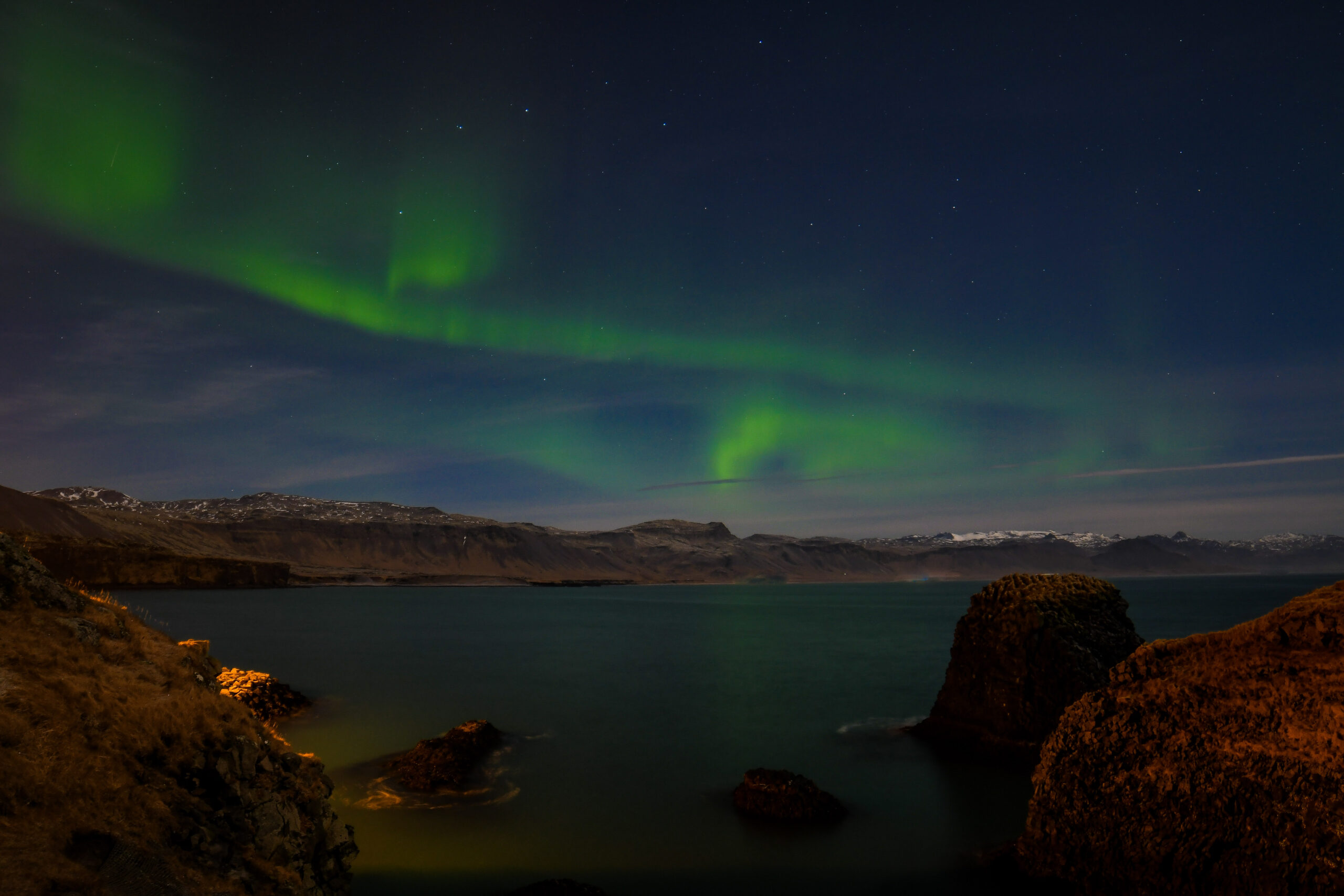 faint aurora over rocky inlet