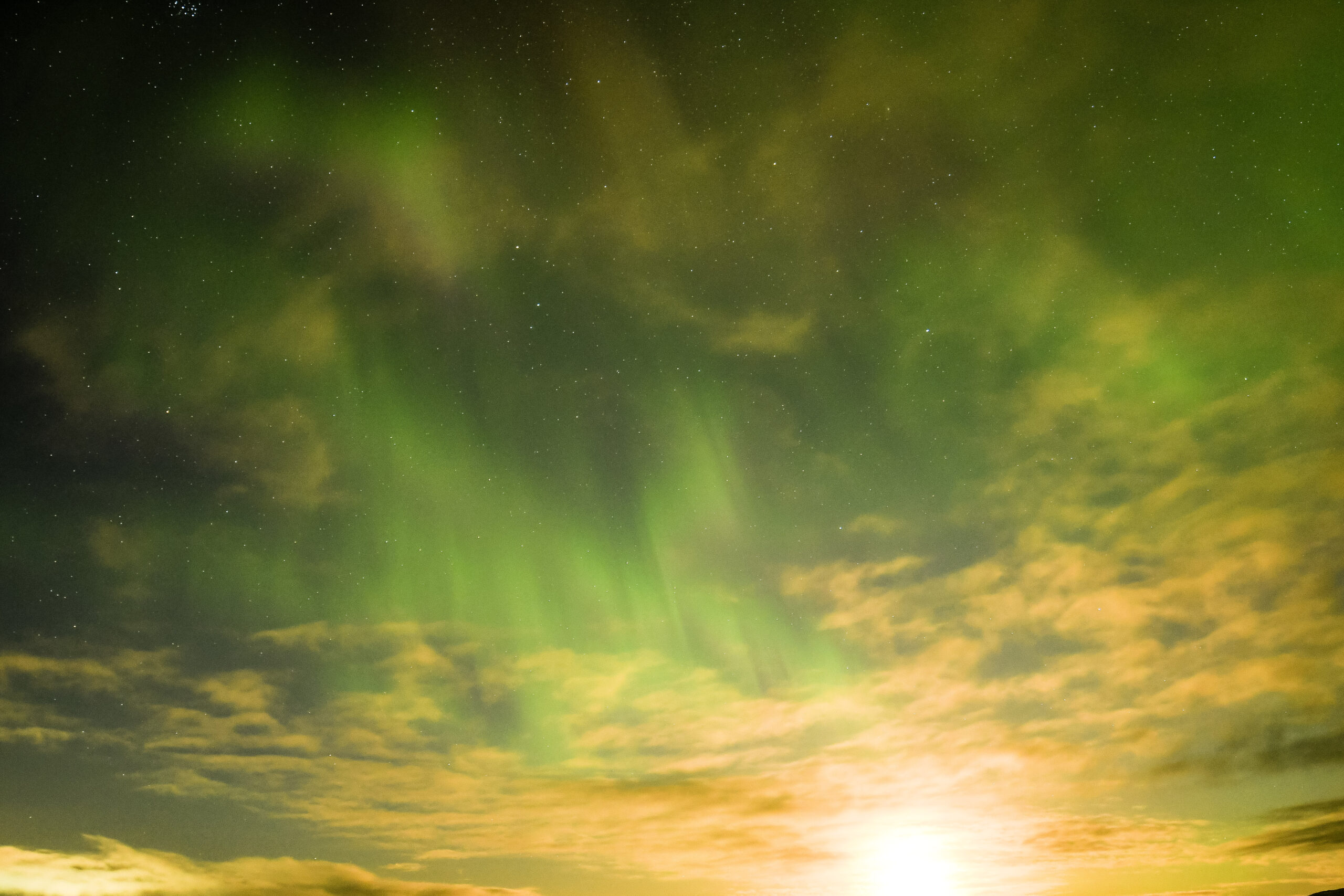 Moon set with pulsating/high solar wind 'patch' aurora formation