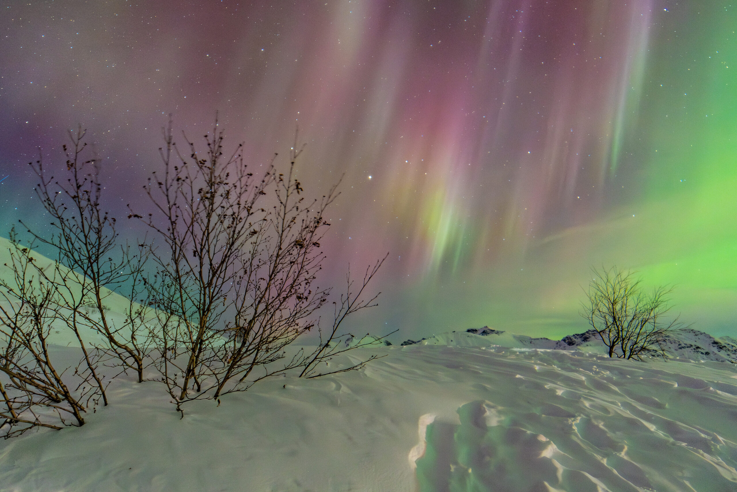 Multi colored aurora and deep snow drifts