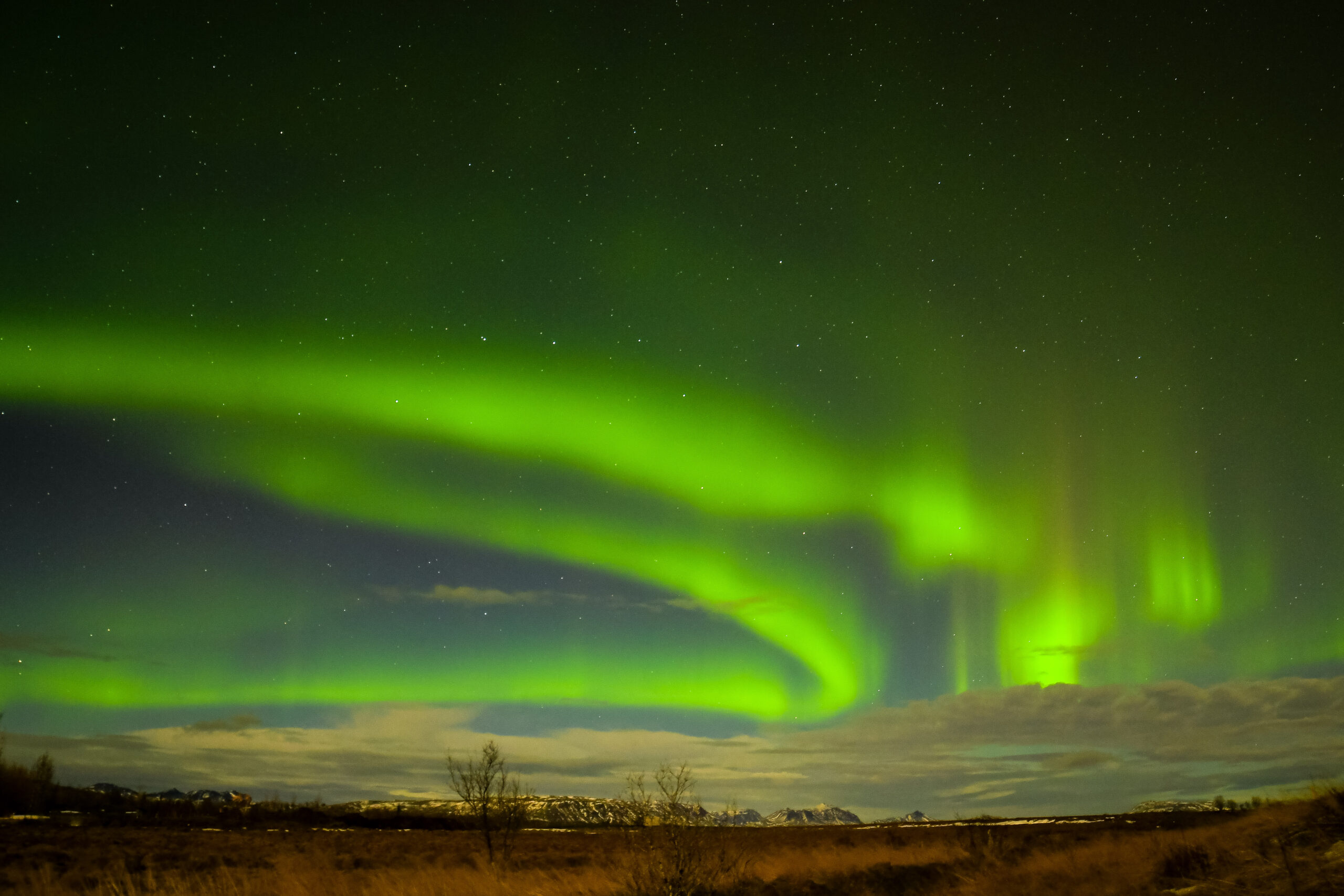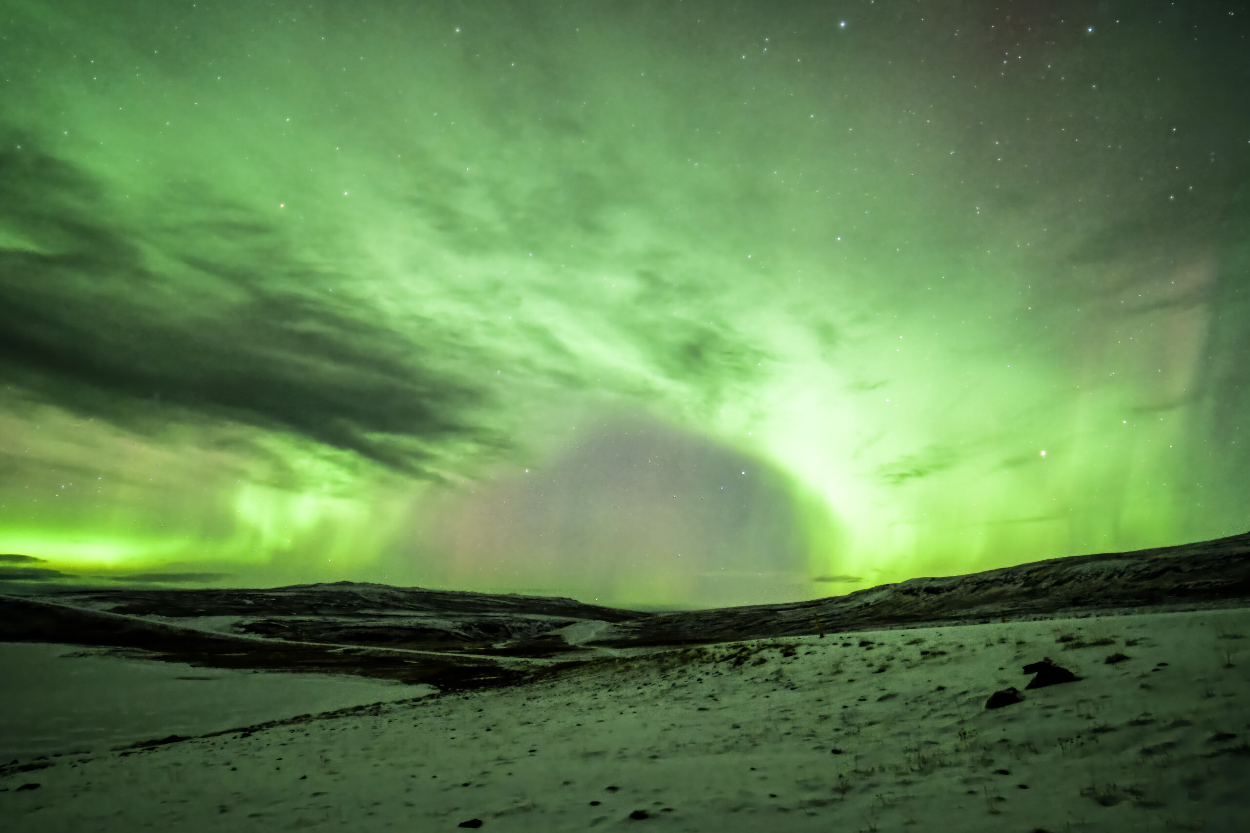 Classic 'hurricane-curl' formation with 'outflow' aurora formation above snowfields