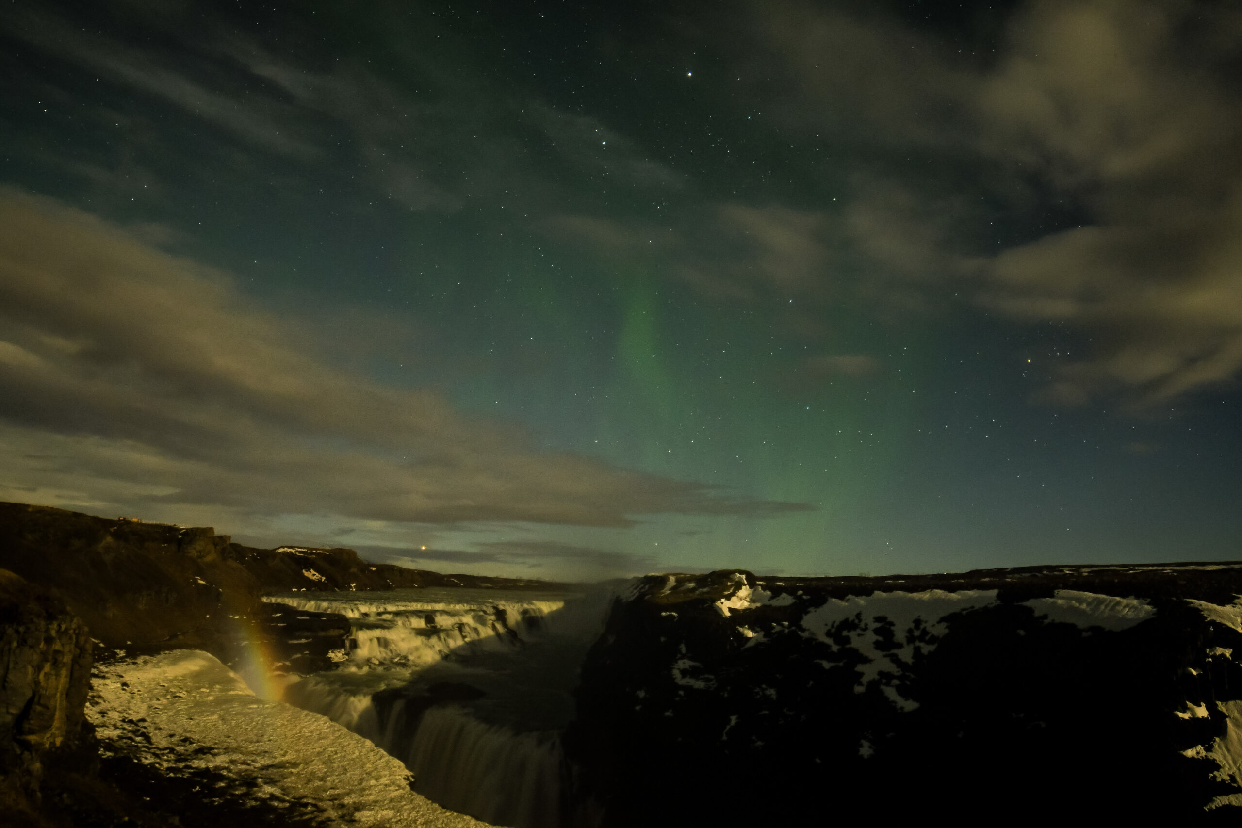 Faint aurora arc and rare 'moonbow' over Gullfoss waterfall
