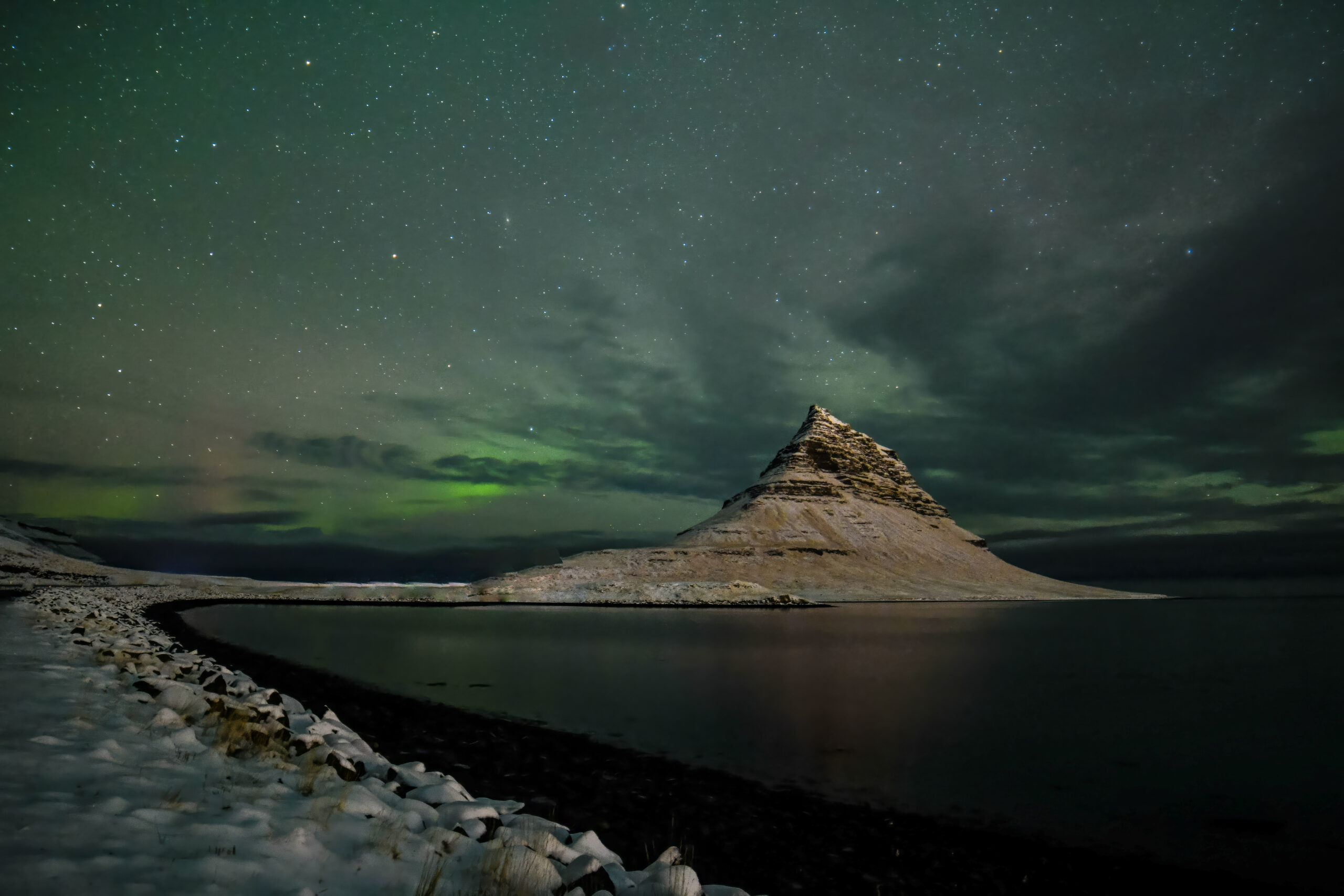 Iconic Kirkjufell Mountain with faint aurora arc and andromeda galaxy #2