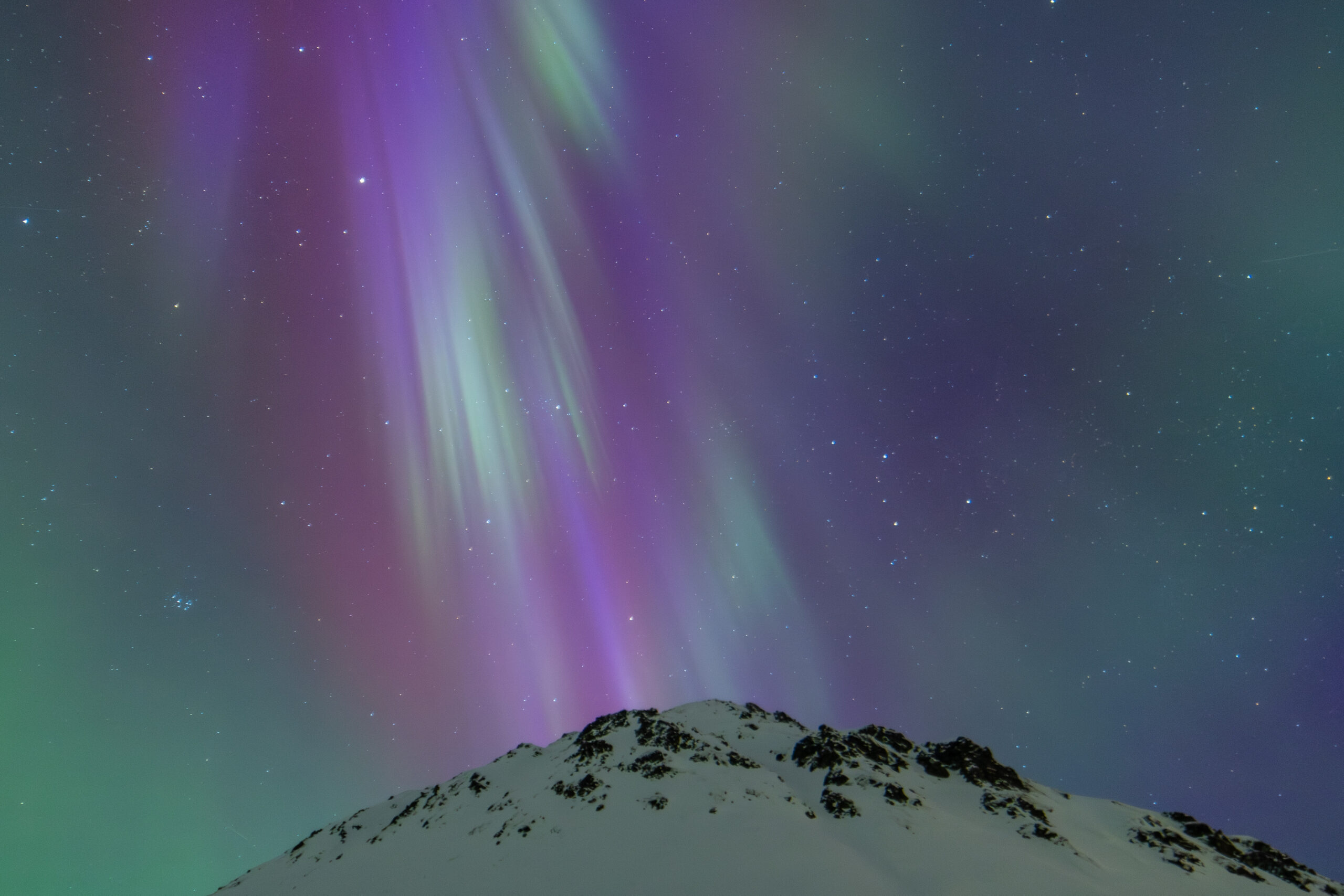 Rare purple, white, and blue aurora beaming above Alaskan Mountain Peak