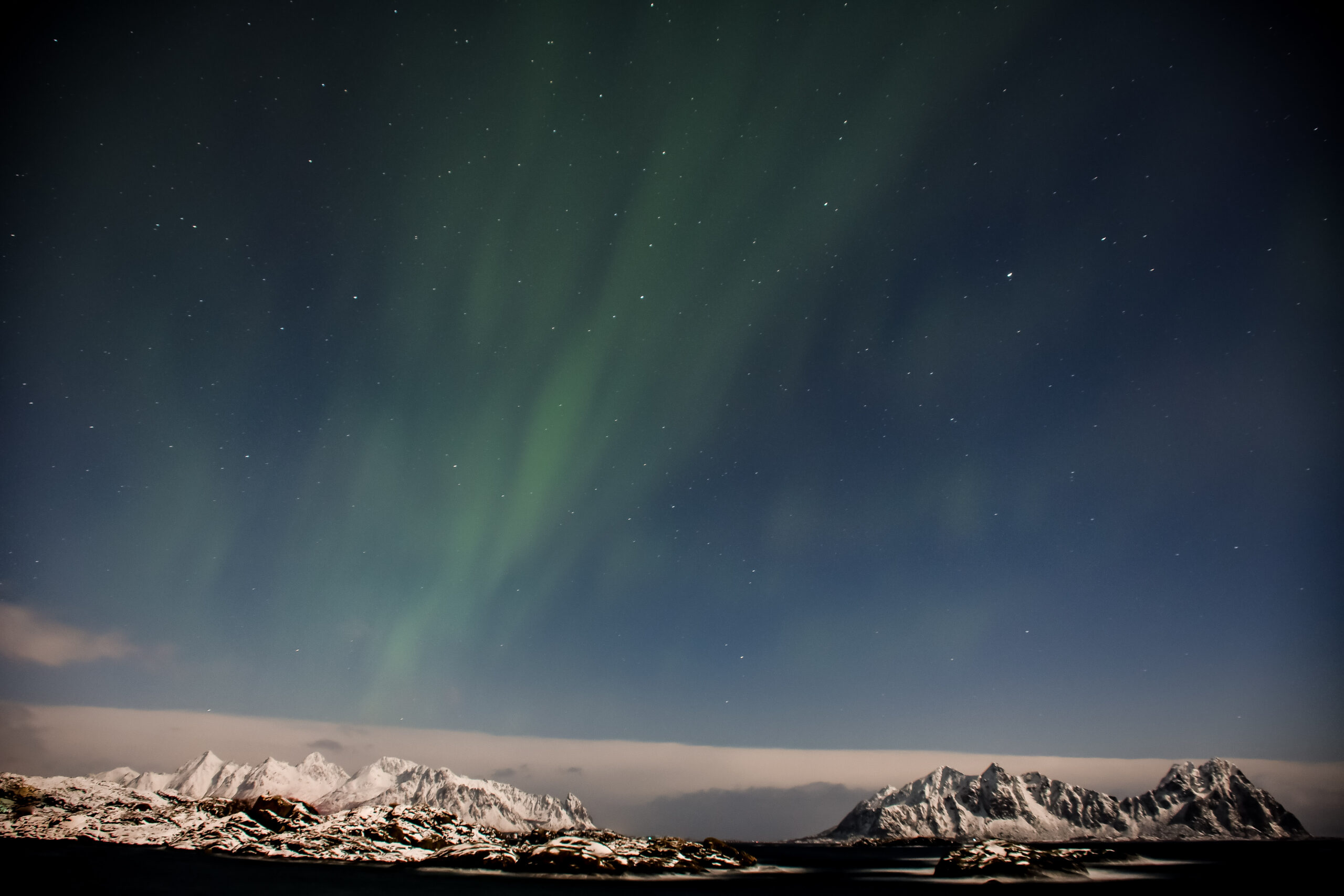 faint aurora arc over distant snow covered mountains/islands with full moon