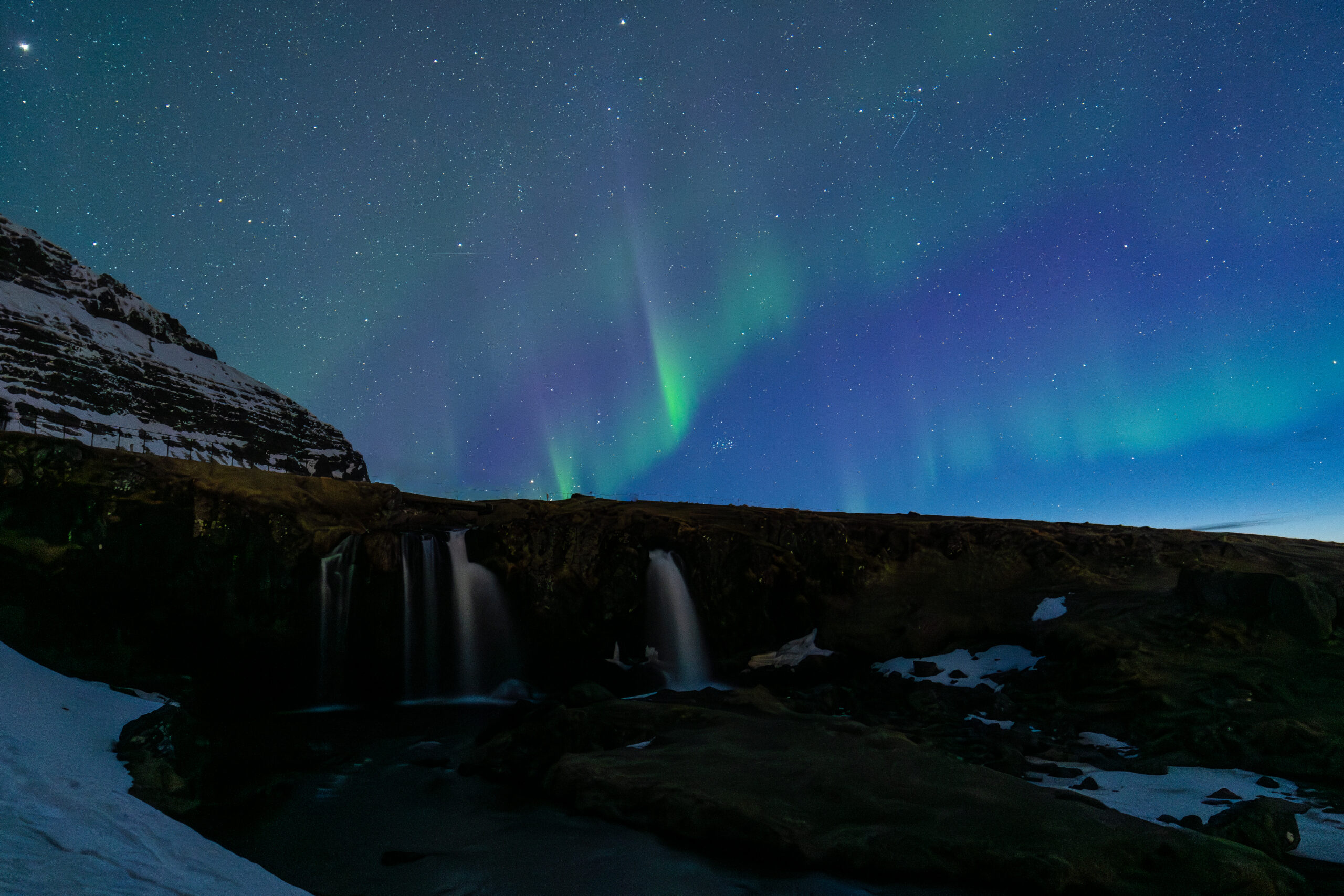 Faint arcs of aurora over small waterfall