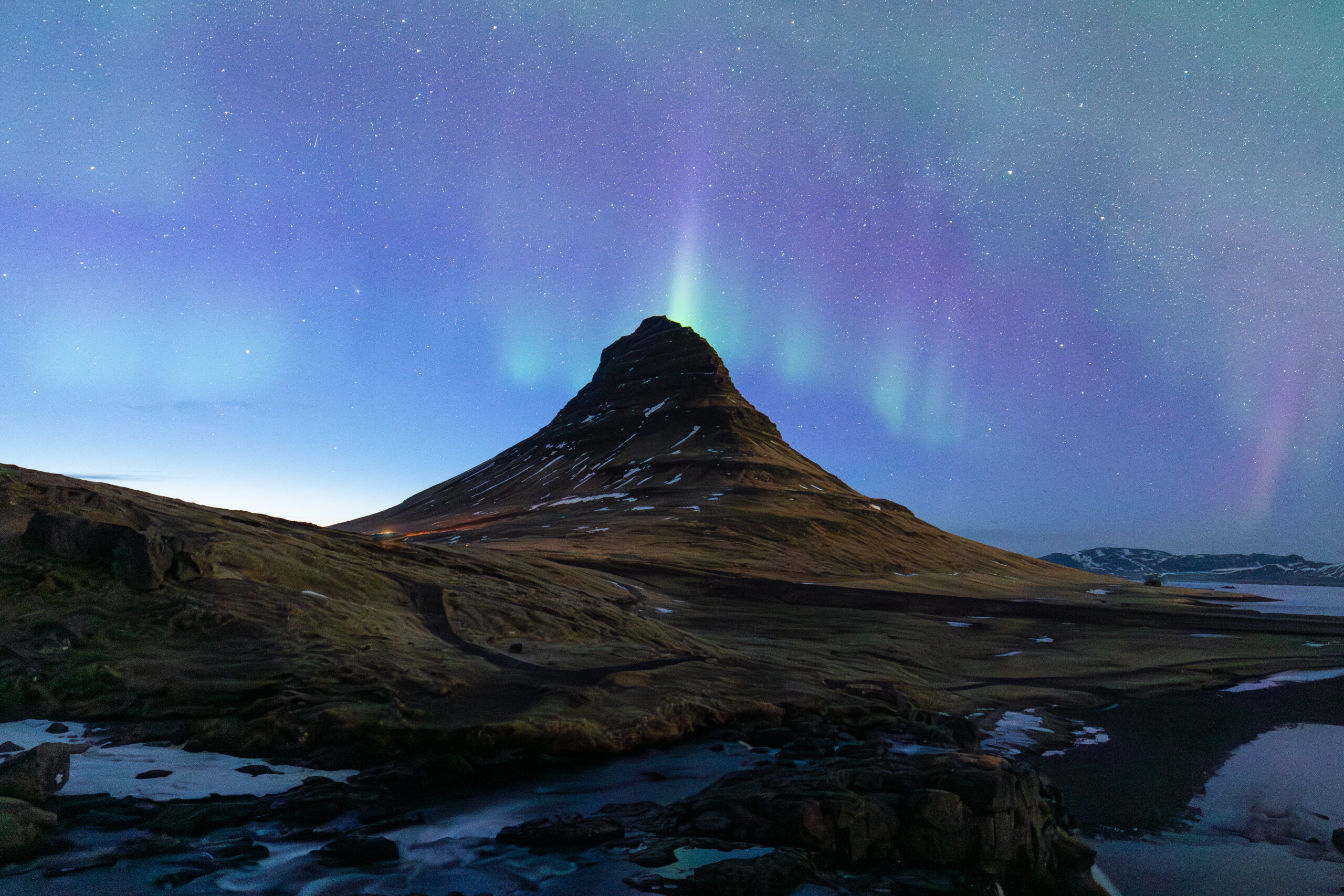 Iconic Kirkufell Mountain at dusk with faint aurora beam from peak #1