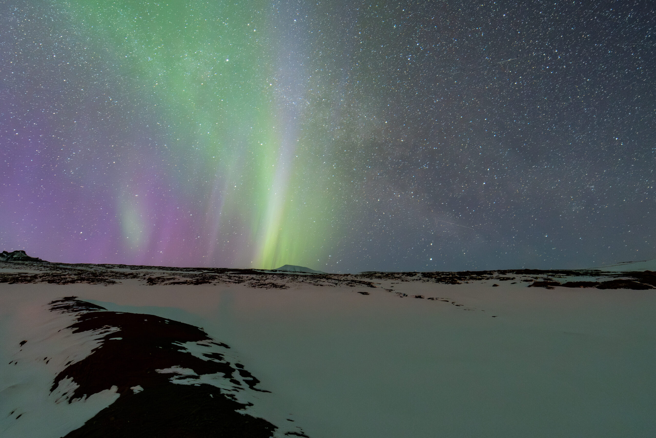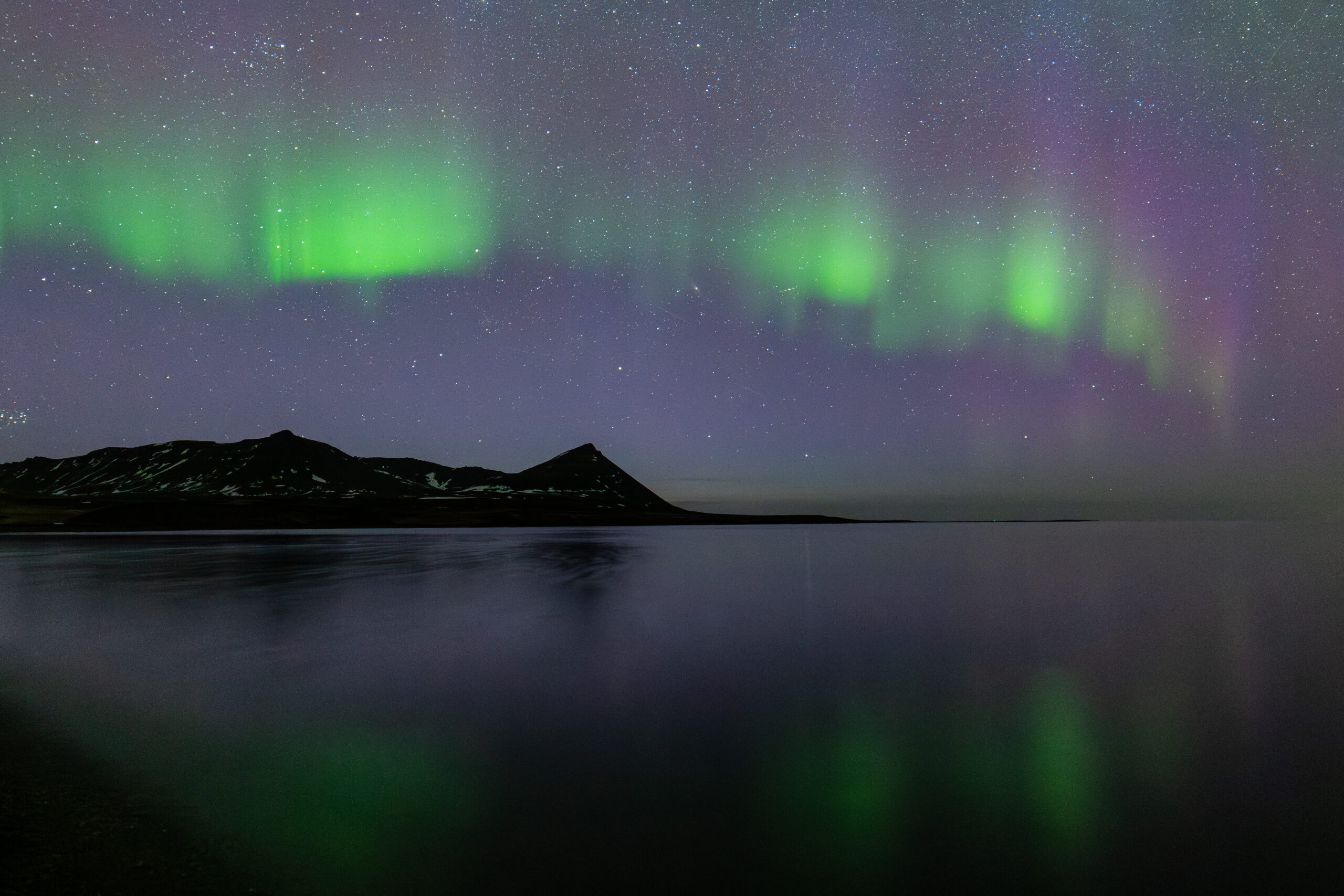 Colorful aurora and Milky Way over Snaefellsnes Highlands