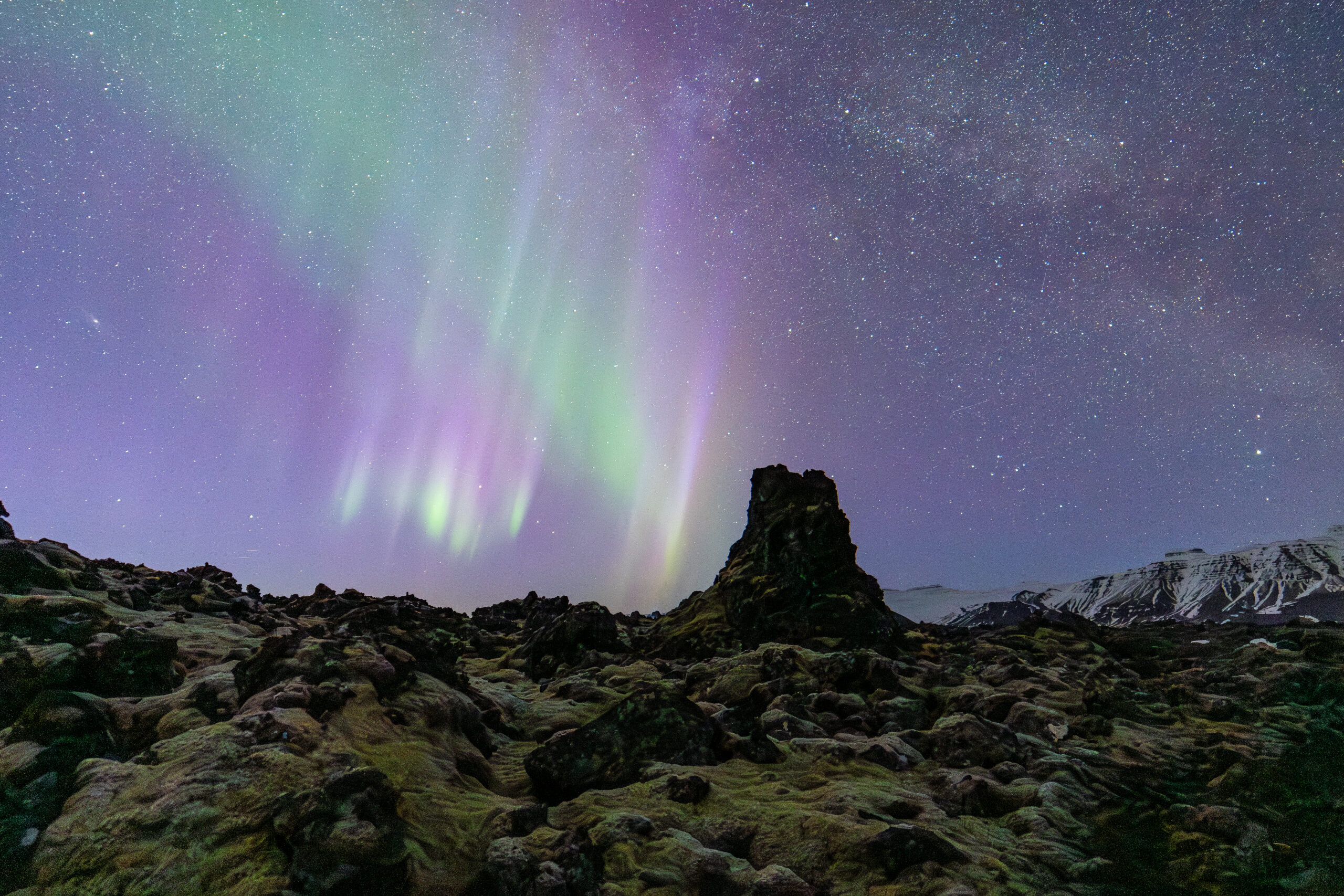 Aurora, Milky Way, and Andromeda Galaxy over Icelandic Lava Field #1