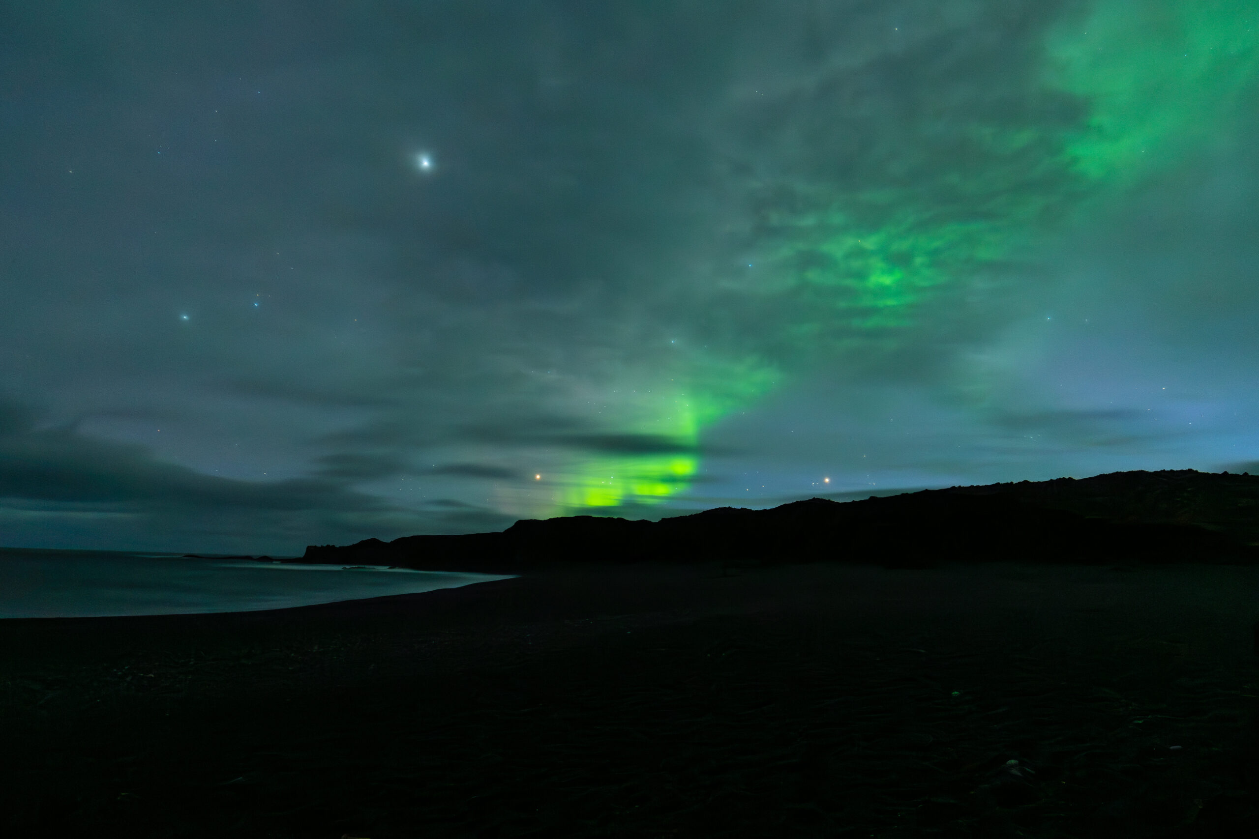 Green aurora between the clouds on black beach